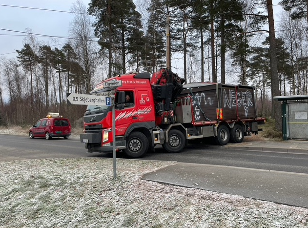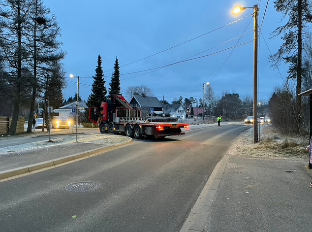Transportbilen rygger inn. Trafikken måtte stoppes i flere minutter. Båtshaka til Per Frode kom godt med for å få på plass stroppene.